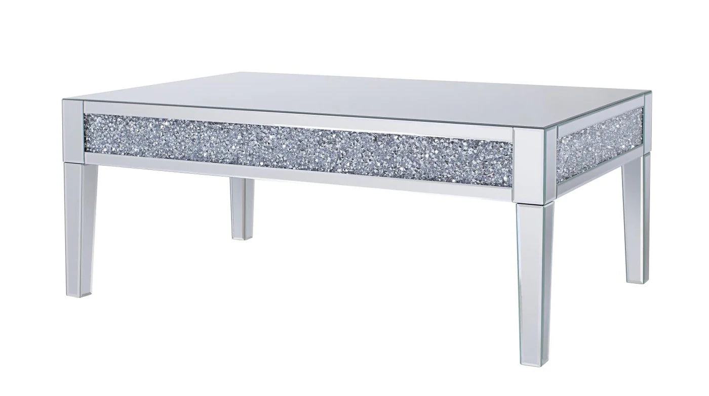 The table features a full mirror beveled frame with tapered legs and a spectacular faux diamond inlay. Large Coffee Table