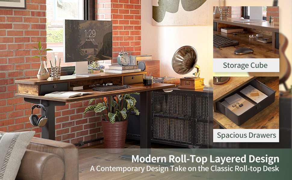 Product Dimensions 60D x 140W x 75H Centimetres Colour Rustic Brown Style Industrial Top material type Alloy Steel Finish type Rustic Brown Special feature 3 Preset Buttons Control, 2 Desk Hook, 1 Cable Management Tray Number of drawers 2 Mounting type Floor Mount