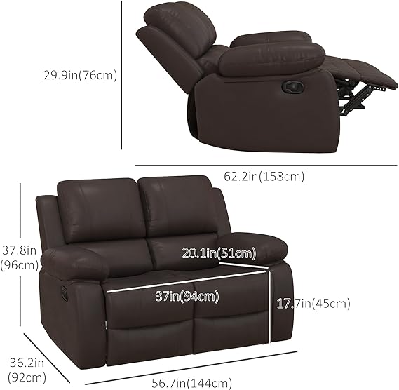 loveseat recliner is designed for small spaces or as an addition to your existing furniture. It is equipped with pullback controls on each side that allow the two reclines to work independently. PU leather recliner sofa from HOMCOM allows you to extend your body from head to toe for relaxation,...