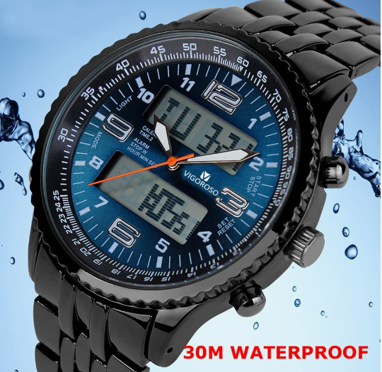 FASHION CASUAL DESIGN: Very big face (47mm / 1.85") and heavy. Black dial with silver watch hand,black watch band. Analog&digital display design, stainless steel band with the simplicity of sports casual. Looks very simple and fashion.Suitable for all types of people.