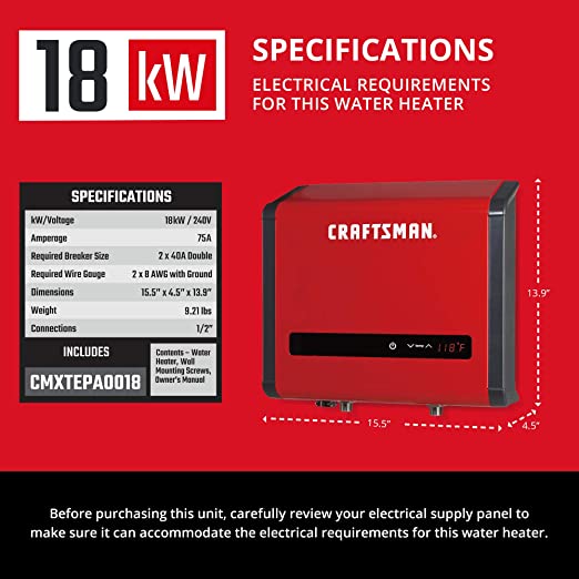 Brand CRAFTSMAN Capacity 3.7 gallons Power source Corded Electric Item dimensions L x W x H 40 x 11.5 x 37.5 Centimetres Colour Red Power/Wattage 18000 Voltage 240 Volts Material Stainless Steel Style 18 kW