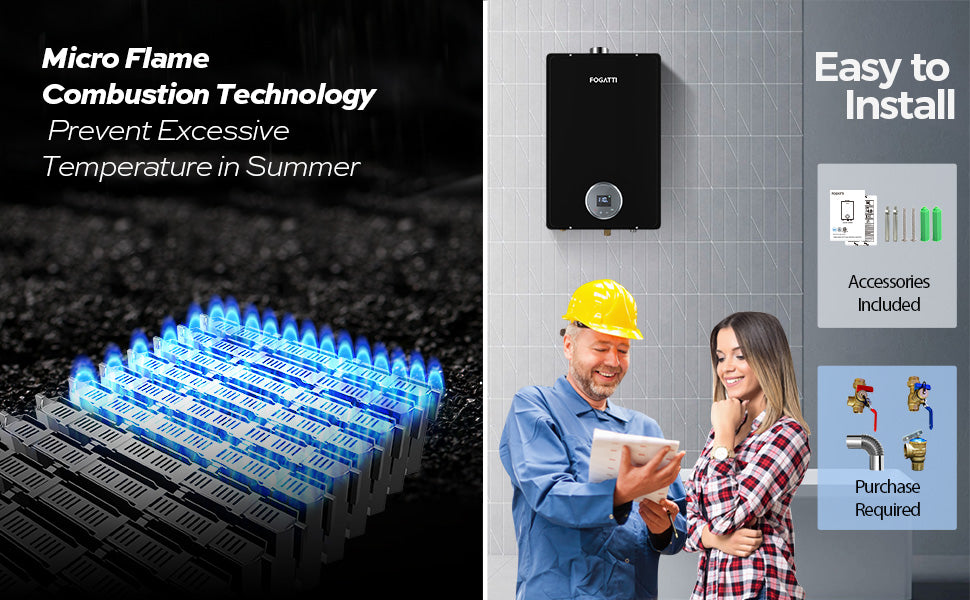 Brand FOGATTI Capacity 7.5 gallons Power Source Liquid Propane Item dimensions L x W x H 66.5 x 43.4 x 18.5 Centimetres Colour Black Voltage 120 Volts Material Copper Style Tankless Maximum operating pressure 150 Pound per Square Inch Mounting Type Wall-Mounted, licensed plumber recommended Manufacturer FOGATTI Part Number FDG420INB-LPG...