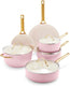 18-piece nonstick cookware set which includes 1 and 2 quarts saucepan pots with lids, 5 quart casserole with lid, 3 quart saute pan pot w/ lid, 8-inch and 10-inch open fry pan, soup ladle, pasta fork, and strainer The PTFE/PFOA/PFOS-free non stick pot set cooking ware features a long lasting...