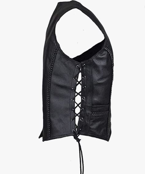 Leather,Nylon Nylon lining Snap closure Machine Wash Womens Black Leather Vest With Braid on Front and Back Side Laces Leather side laces for adjustable fit Button-snap front closure